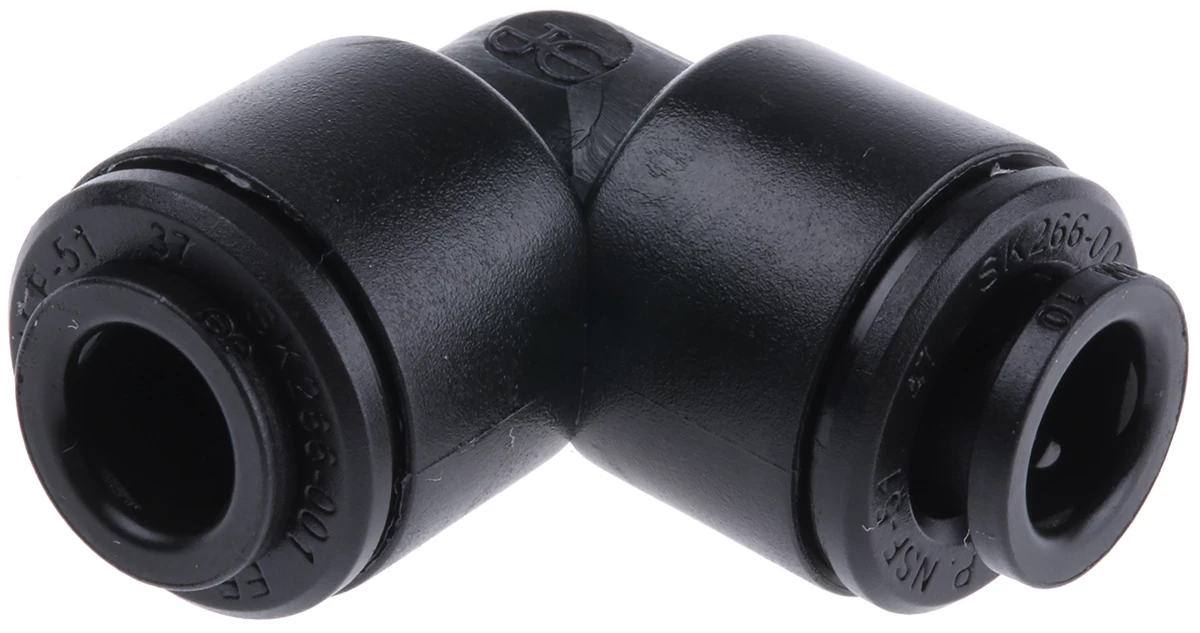 Съединител с бърза връзка, предназначен за тръби с външен диаметър 6 mm. Този фитинг е част от серията PM на John Guest с прав ъгъл (90° коляно) и се използва широко в пневматиката, хранително-вкусовата промишленост и системите за пречистване на вода.