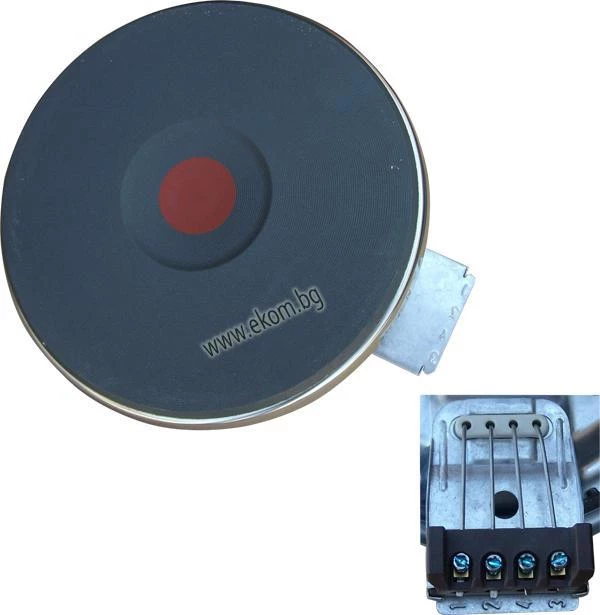 Плоча чугунена 2000W, диаметър 220mm, червена точка бързозагряваща. Може да бъде инсталирана на български печки с 5-тактов ключ(4+0), като се направи мост на клеми с позиция 3 и 4 на самата плоча.