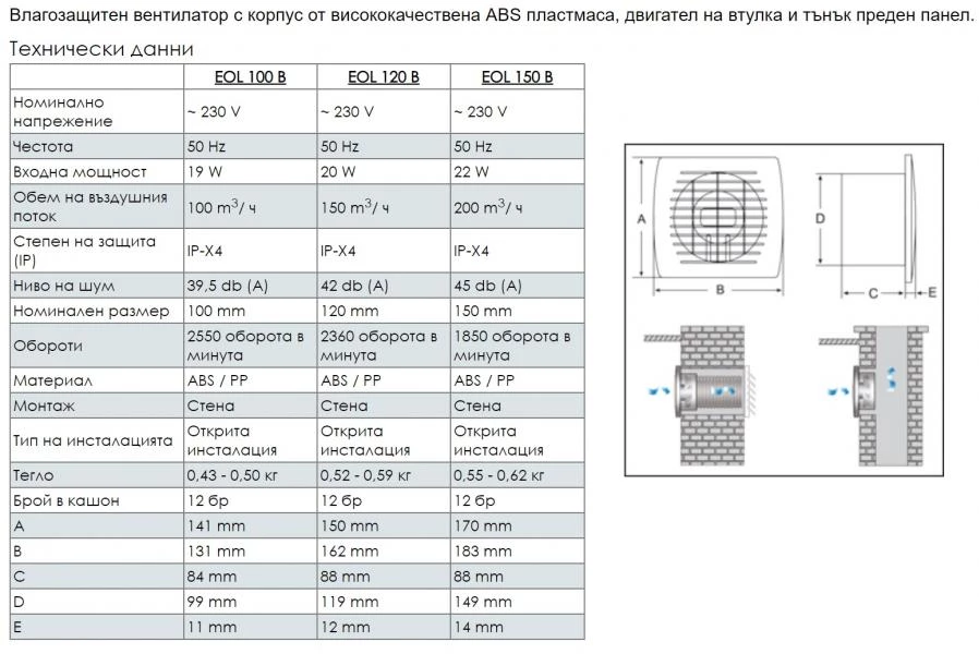 115134 Битов вентилатор за баня ELPLAST EOL 120 B с диаметър Ф120 и дебит 150 m3/h Марка: Elplast Напрежение, V / 50Hz: 1*230 V Мощност, W: 20 W Дебит, m3/h: 150 m3/h Налягане, Pa: 40 Pa Ниво на шум, dBA 3m: 42 dBA/3m Клас на защита, IP: X4 IP Гаранционен срок, месеца: 36 месеца Диаметър на вентилатор, mm: 120 mm Тип на двигателя: На втулка Аксиален