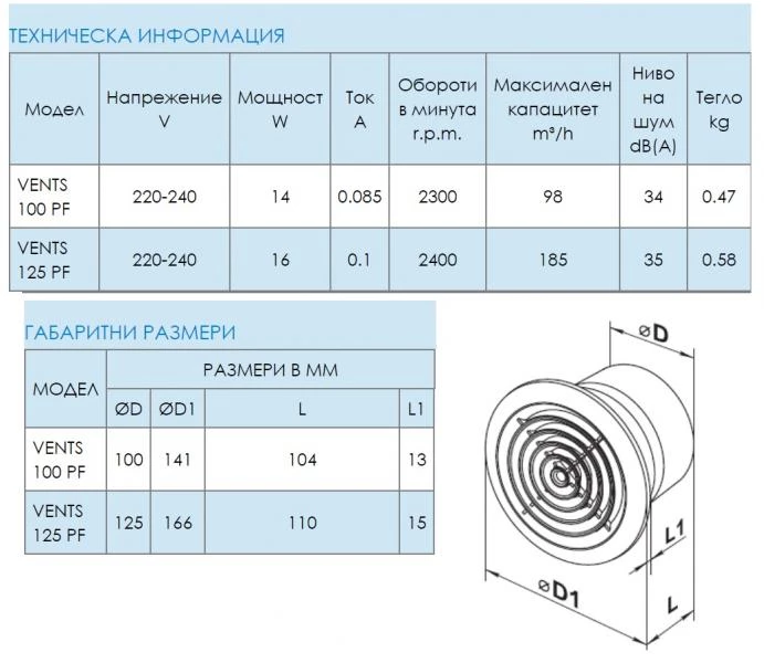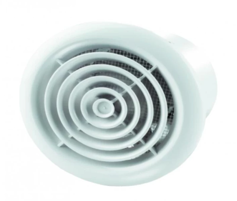 115143 Аксиален вентилатор за извеждаща вентилация Ф100мм. ПРИЛОЖЕНИЕ: Постоянна и или периодична вентилация на бани, кухни и други сервизни помещения.Монтаж във вентилационна шахта или въздуховод.Размери съвместими с въздуховоди 100, 125 или 150 mm. ДИЗАЙН: Модерен дизайн и естетичен вид.Корпуса и перката са произведени от висококачествена ABS пластмаса, UV устойчива.Интелигентния дизайн на перката дава на вентилатора висока ефективност и дълъг живот. Клас на защита IP 34. ДВИГАТЕЛ: Надежден ниско ватов мотор.Проектиран за продължителна работа без необходимост от поддръжка.Вградена защита от прегряване.