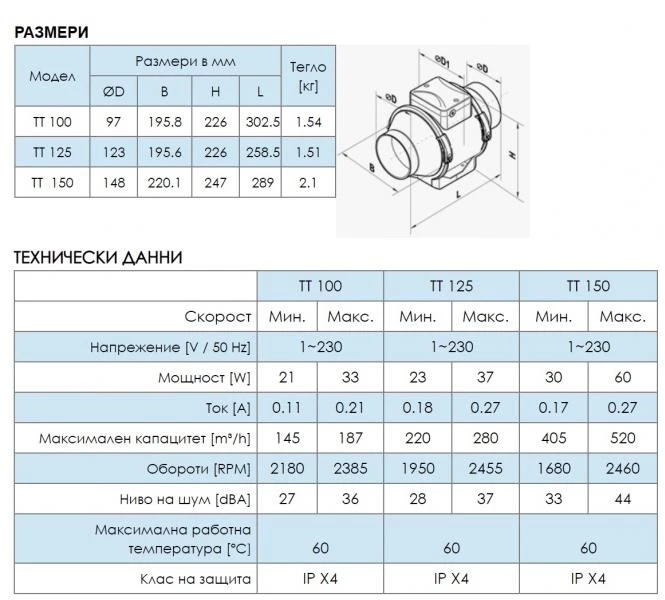 115148 Канален двускоростен вентилатор с пластмасов корпус и капацитет до 520 m³ / ч. Ф 125mm. ПРИЛОЖЕНИЕ: Вентилаторите VENTS TT се отличават с широките възможности и високата производителност на аксиалните и центробежните вентилатори. Специално проектирани за извеждаща или захранваща вентилация на помещения изискващи високо налягане, мощен въздушен поток и ниско ниво на шум. Вентилаторите са съвместими с кръгли въздуховоди от Ø100 до Ø150 мм според модела. Вентилацията изградена чрез вентилаторите ТТ са най доброто решение за бани и кухни, както и други влажни помещения, апартаменти, вили, кафенета, барове и други.