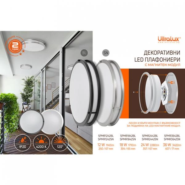 UltraLux допълва гамата от декоративни светодиодни плафониера с осем нови модела с четири мощности – 12W, 18W, 24W, 36W и два цвята: черен - SPMR1242BL, SPMR1842BL, SPMR2442BL, SPMR3642BL и сатиниран никел - SPMR1242SN, SPMR1842SN, SPMR2442SN, SPMR3642SN.