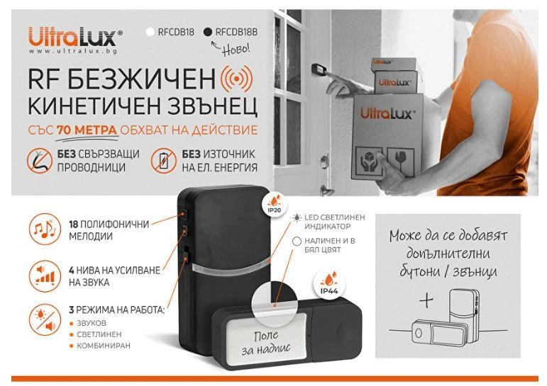ltraLux представя нов модел безжичен звънец RFCDB18B, с който допълва гамата от кинетични продукти. Новият модел е идентичен с вече наличния модел RFCDB18, но е в стилен черен цвят. Те се характеризират със следните предимства: